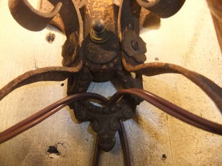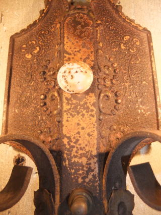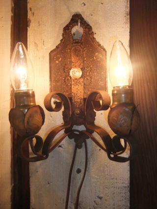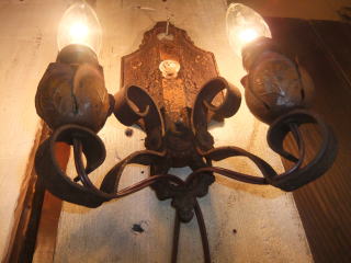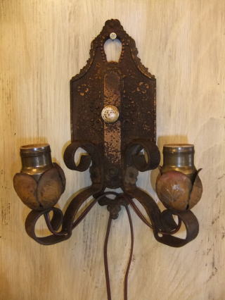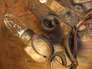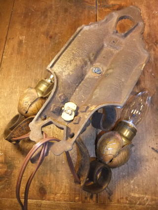 | ◎1890年位のアンティークライトです。 とても古い鉄製です。 写真は壁の釘にに引掛けているだけですが壁にしっかりと設置できる金具もお付けします (写真参照) 中央にあるボタンスイッチはダミーです すぐに使えるようメンテナンス済みのアンティークな照明です コード新品 ソケット他メンテナンス済みなのですぐに使用できます。 壁への設置は タイプになります。 詳しくはコチラを参照ください。 |
