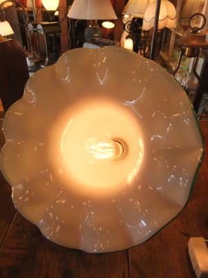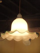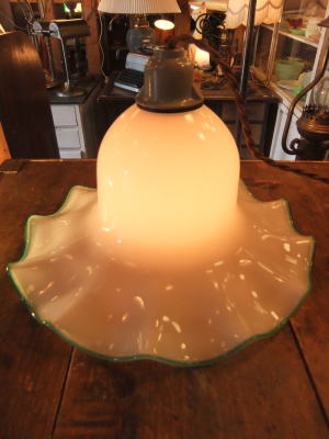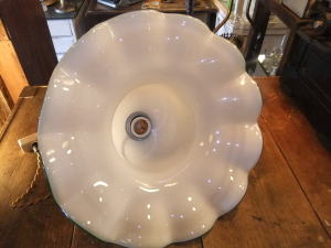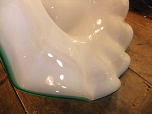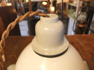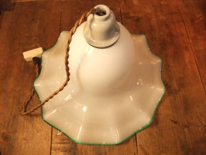 | 緑縁のミルクガラスシェードペンダントです。 昭和の中ほどの物でガラスもユラユラでボッテリとしています。 一般のサイズよりも大きく存在感あります。 コード新品 ソケット新品 他メンテナンス済みなのですぐに使用できます。 天井への設置はペンダントタイプになります。 詳しくはコチラを参照ください。 |